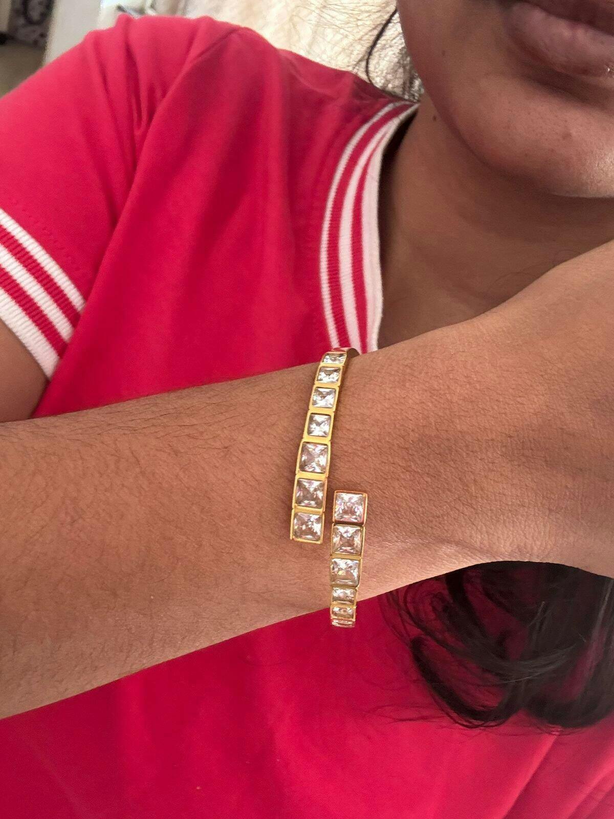 A stunning piece of everyday luxury, this gold-toned bangle features a continuous, sparkling row of brilliant, princess-cut cubic zirconia stones. Each square-cut stone is meticulously prong-set, catching the light from every angle. It's the perfect blend of classic elegance and modern geometry, designed to transition effortlessly from a day at the office to a glamorous evening out. An essential addition to any curated jewelry collection.